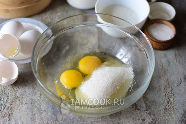 Готовим ванильный бисквит так же, как и шоколадный, со следующими отличиями: какао не добавляем, а добавляем ванильный экстракт. В миску вбиваем яйца, добавляем сахар, взбиваем миксером до пышной пены.