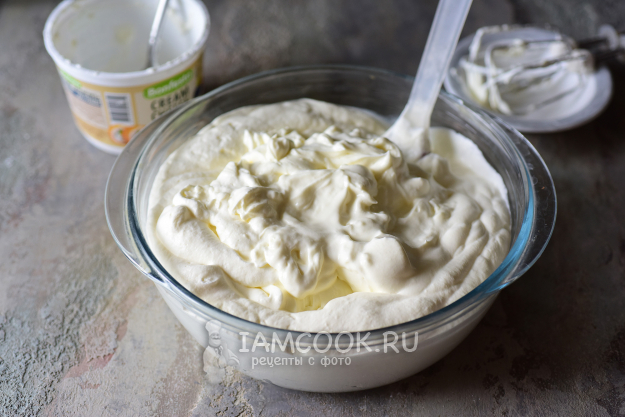 Добавляем взбитые сливки к сырной массе, после чего миксером взбиваем все ингредиенты до получения однородного воздушного крема.