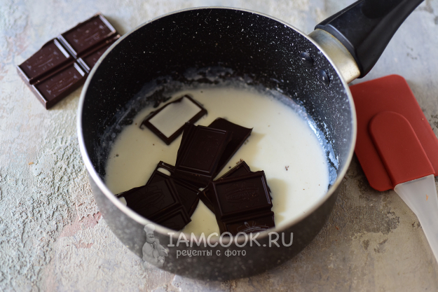Сливки разогреем в сотейнике, не доводя до кипения. Сотейник снимем с плиты, выложим в горячие сливки поломанный на кусочки шоколад.