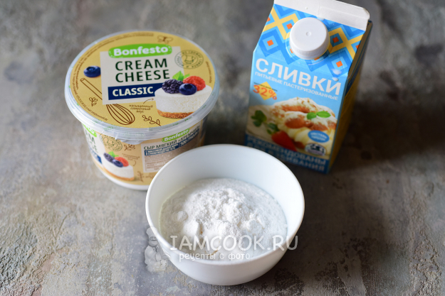 Готовим крем чиз на сливках. Подготовим необходимые ингредиенты. Используем обязательно в работе охлажденные сливки с жирностью 30-33%, также используем обязательно сахарную пудру, а никак не сахар. Творожный сыр выбирайте на свой вкус, мне очень нравится Cream Cheese, можно также использовать Маскарпоне, Филадельфия и т.д.