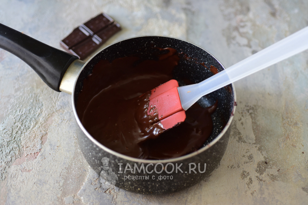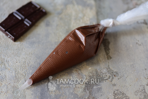 Выложим готовую шоколадную глазурь в кондитерский мешок, отрежем кончик у мешка.