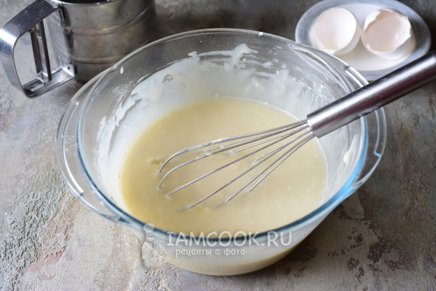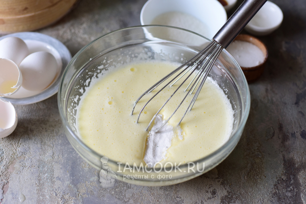 Зальем в яичную смесь молоко, растительное масло, добавим соль, соду. Венчиком все перемешаем.
