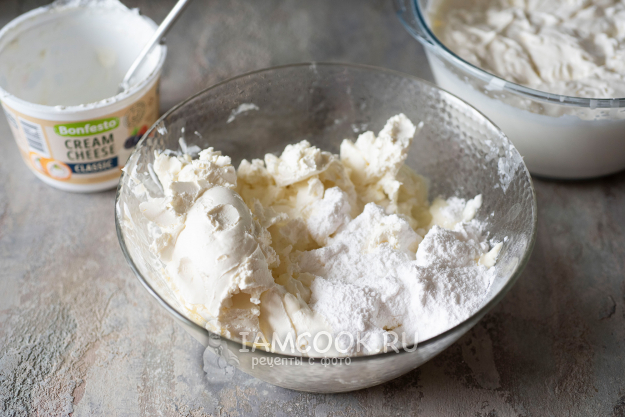 В миске соединяем мягкий творожный сыр и сахарную пудру, миксером взбиваем ингредиенты до получения однородной смеси. В отдельной емкости взбиваем холодные сливки до кремообразного состояния.