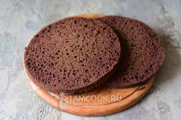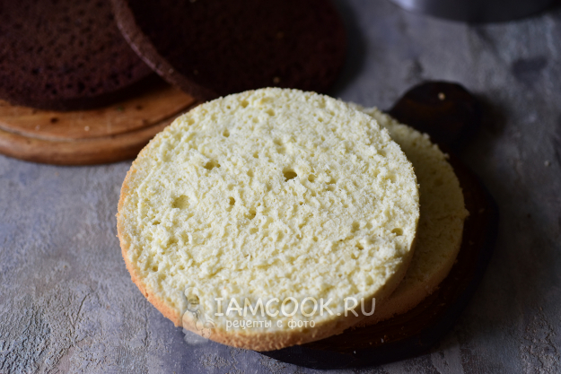 Готовый бисквит полностью охлаждаем, срезаем неровную верхушку и разрезаем на два диска.