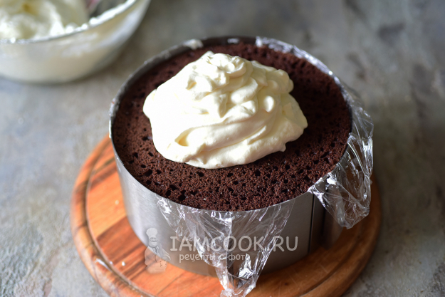 Приступаем к сборке торта. В разъемное кольцо выкладываем сначала шоколадный бисквит и сверху выкладываем 200 г крема чиз, разравниваем лопаткой, сверху выкладываем ванильный бисквит, немного прижимаем его, чтобы крем распределился более равномерно в прослойке.