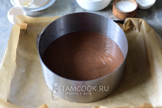 Подготовим форму для выпекания (выложим дно пищевым пергаментом), выложим все шоколадное тесто. Отправим выпекаться шоколадный бисквит при температуре 180 градусов примерно на 40 минут. Готовность проверяем на сухую лучину.