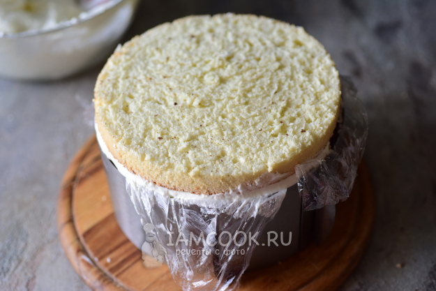 Поверх выкладываем последний ванильный бисквит, немного вдавливая. В таком виде собранный торт в кольце отправляем в холодильник на ночь для пропитки и стабилизации.