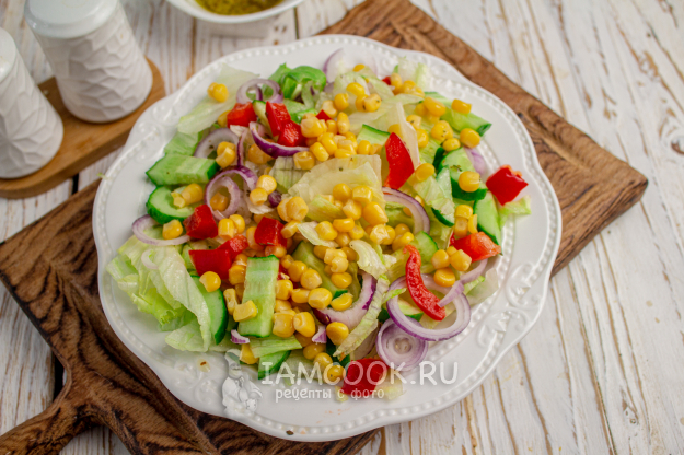 К салату добавьте мелко нарезанный сладкий перец, консервированную кукурузу и свежие огурцы, нарезанные на небольшие кусочки.