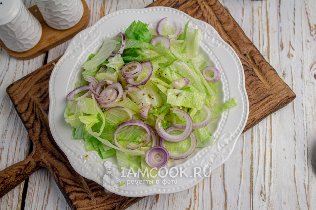 На тарелку порвите салат, полейте половиной от общей нормы заправки. Красный лук нарежьте тонкими колечками и тоже выложите на салат. Перемешайте слегка листья салата с заправкой, чтобы она хорошо распределилась.