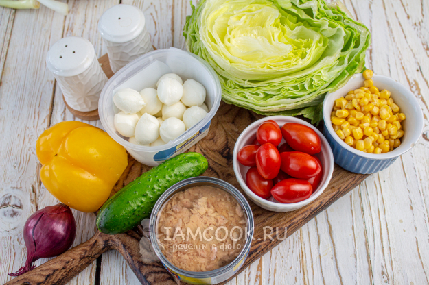 Подготовьте все необходимые ингредиенты для приготовления салата с тунцом и моцареллой.