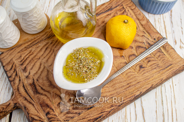 Приготовьте заправку: оливковое масло Extra Virgin смешайте с соком лимона, сушеным орегано, солью и черным молотым перцем по вкусу.
