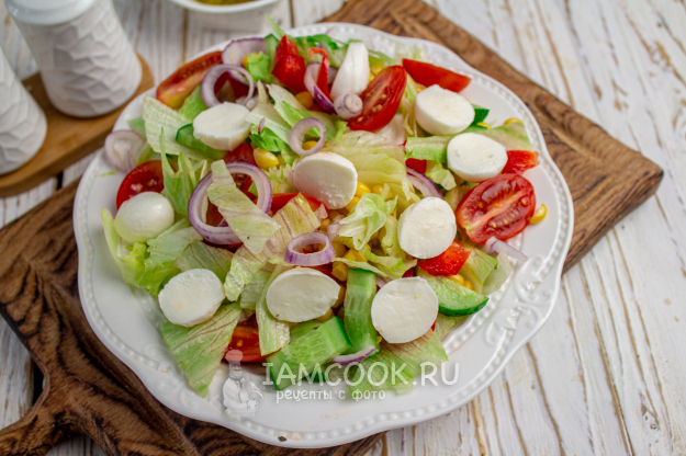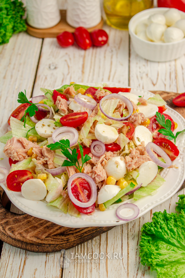 Салат с тунцом и моцареллой готов. Подавайте его сразу на стол, чтобы листья салата оставались хрустящими. Приятного аппетита!!!