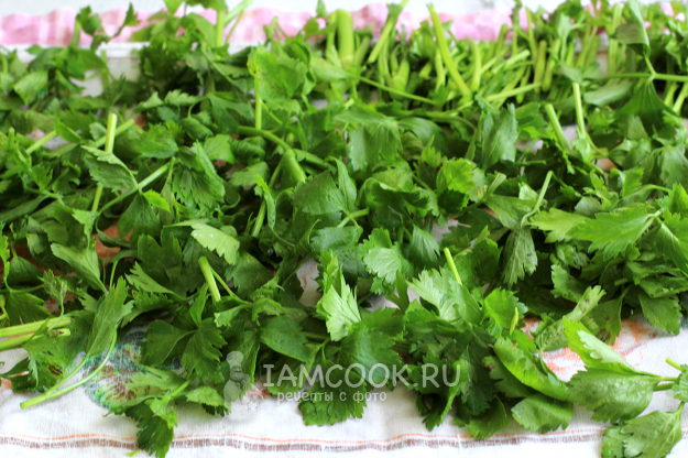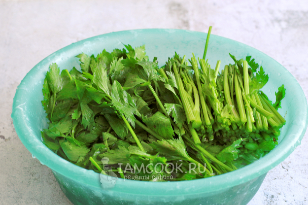 Отделите крупные стебли у сельдерея и тщательно промойте сырье, несколько раз сменив воду.