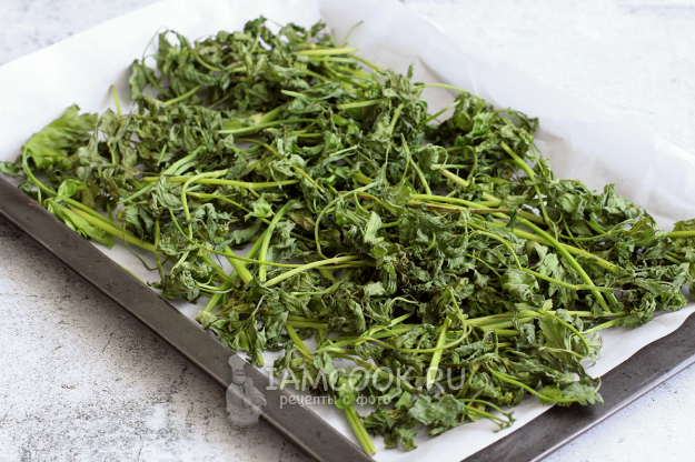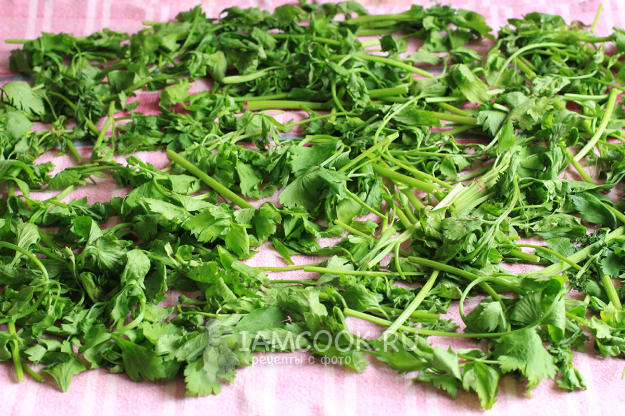 Чтобы упростить весь процесс, желательно отделить абсолютно все стебли от листьев и нарезать все по отдельности. Затем вымытую траву разложите на толстом полотенце или ткани и обсушите с помощью другого полотенца.