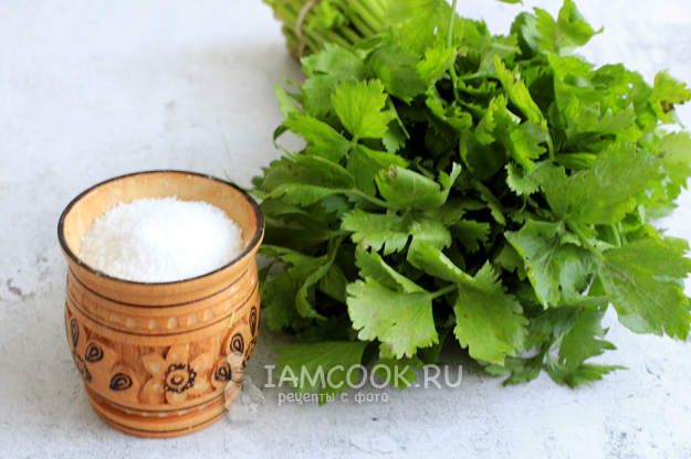 Итак, для приготовления сельдерейной соли возьмите примерно 350-370 г свежего сельдерея. Соль берите каменную крупную или морскую. Пропорции я даю в перечне продуктов, а вы всегда можете рассчитать все конкретно для себя, в соответствии с полученным сухим сырьем.