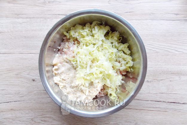 Молодую капусту нарежьте, выложите в кастрюлю и залейте водой. Варите с момента закипания 5-8 минут. После воду слейте, капусту немного охладите и выложите в миску с мясным фаршем.