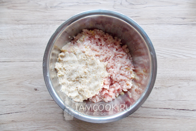 Белый батон, булку или хлеб замочите в холодной кипяченой воде и через несколько минут отожмите. Вместе с куриным филе и мякотью свинины пропустите через мясорубку.