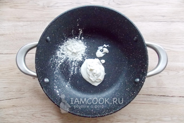 Приготовьте сметанный соус. В глубокую сковороду или сотейник выложите муку и сметану.