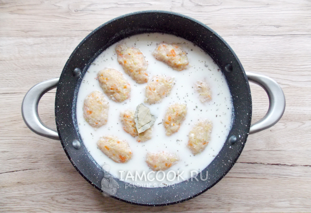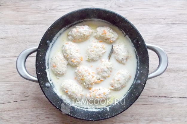 Из приготовленного фарша сформируйте ленивые голубцы и выложите в сотейник со сметанным соусом. Добавьте лавровый лист.