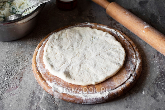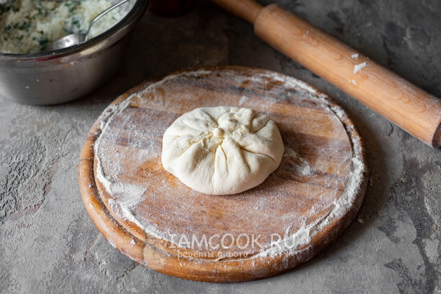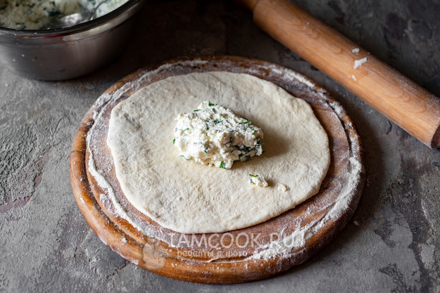 От общей массы теста будем отделять кусочки теста весом примерно в 100 г. Такой кусочек теста раскатаем на хорошо припыленной мукой рабочей поверхности в лепешку диаметром примерно 15-20 см. На центр лепешки выложим 1 ст.л. творожной начинки.