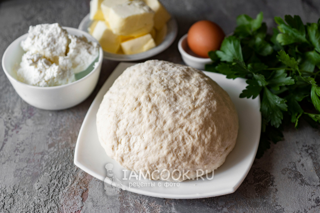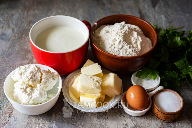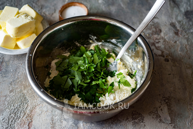За это время приготовим начинку. В миске вилкой разотрем весь творог, вобьем яйцо, добавим соль и мелко порубленную петрушку. Перемешаем. Начинка готова.