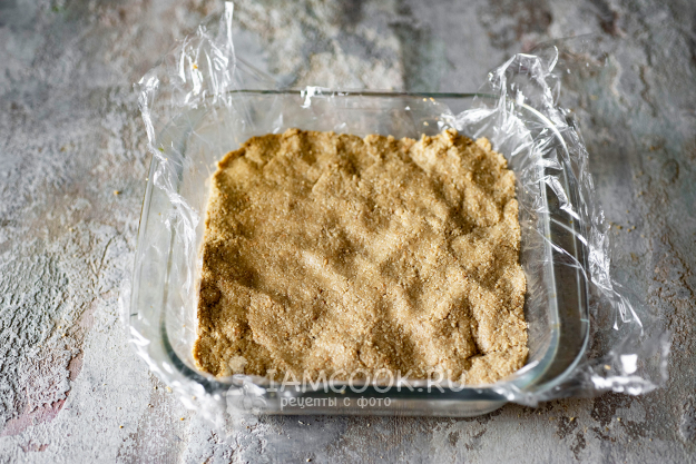 Выложим эту массу в форму, которую очень удобно заранее выстелить пищевой пленкой, и разровняем ложкой или руками. Отправим заполненную форму в холодильник на 2-3 часа для стабилизации.