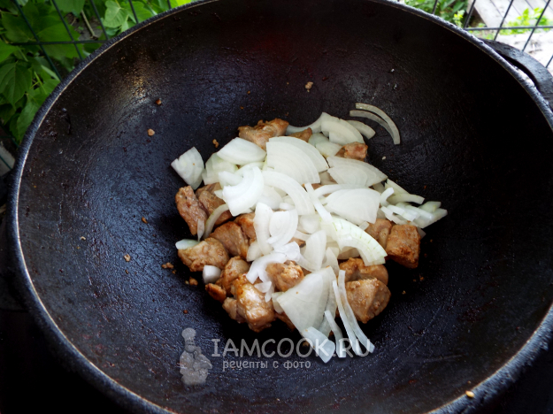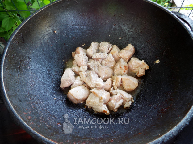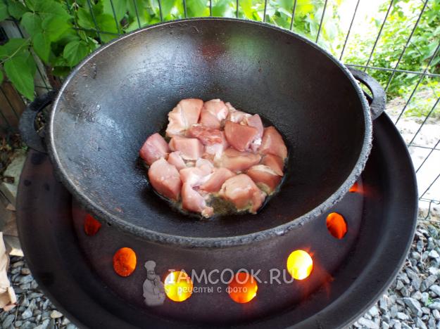 Казан поставить на огонь, накалить в нём масло.