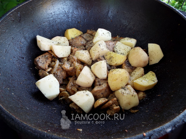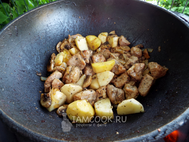 Готовить свинину с картошкой в казане на костре, помешивая, до готовности картофеля.