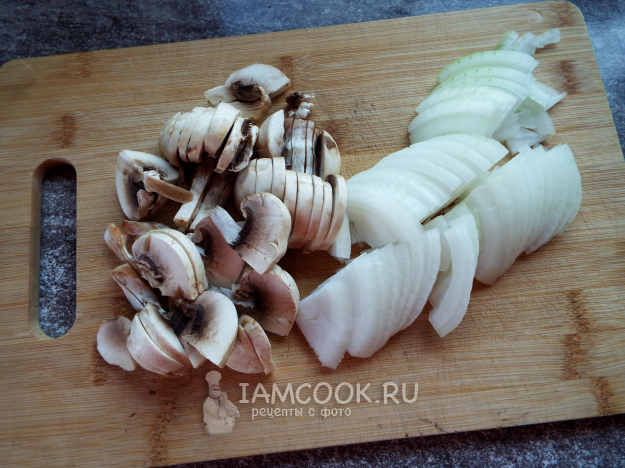 Лук - четверть-кольцами, грибы - пластинками.