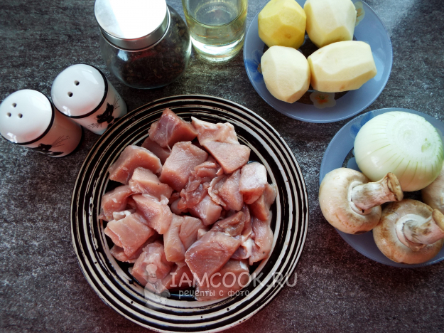 Свинину не крупно нарезать, лук и картофель почистить.