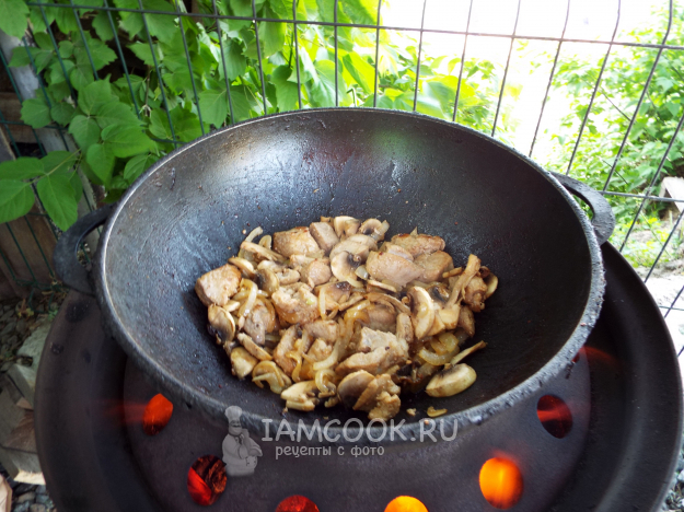 Затем отправить в казан грибы. Поджарить в течение пары минут.