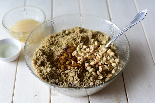 Затем содержимое чаши блендера переложим в просторную миску, добавим изюм и оставшуюся часть арахиса (50 г) - я немного порубила арахис ножом. Все ингредиенты активно перемешаем для равномерного распределения по массе.