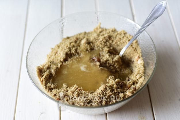 К этой массе зальем подсолнечное масло и жидкий мед. Все активно перемешаем - можно ложкой, я перемешивала руками - до получения однородной пластичной массы.
