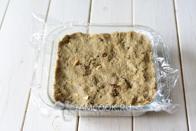 Удобную форму выстелем пищевой пленкой и всю приготовленную массу выложим в эту форму, разровняем ложкой или руками, утрамбовывая в пласт. Отправим в холодильник на 3-4 часа.