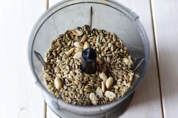 Затем семечки подсолнуха и арахис выложим в чашу блендера, будем измельчать до желаемой степени измельчения.