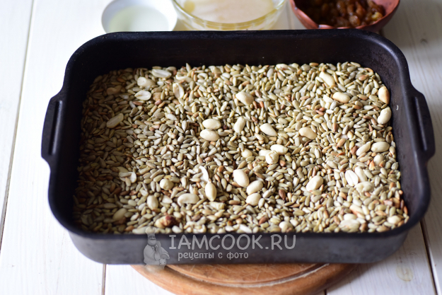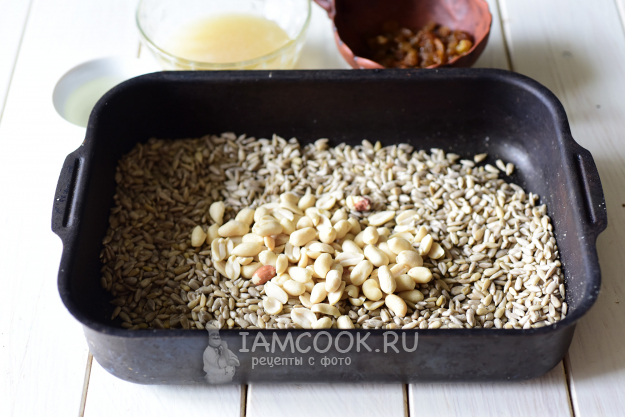 На противень выложим все семечки подсолнечника и 50 г арахиса.