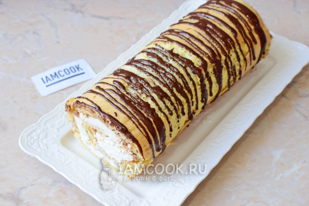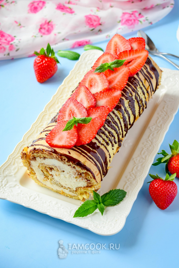 Для украшения полейте рулет растопленным шоколадом. Уберите бисквитный рулет с маскарпоне и сливками в холодильник на 2-4 часа, чтобы он пропитался и немного застыл.