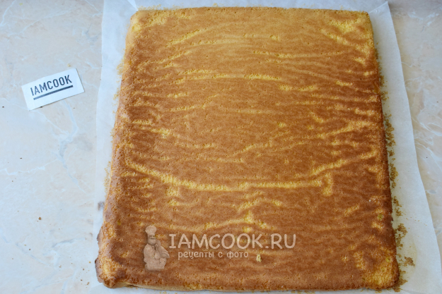 Готовый бисквит станет золотистого цвета. Извлеките его из духовки и отделите от листа пергамента.
