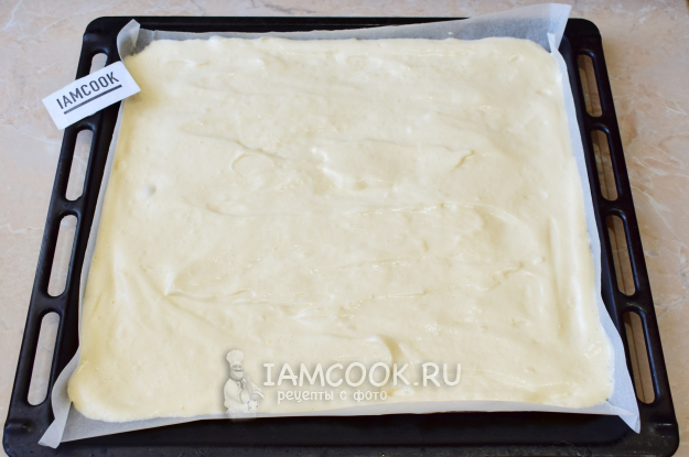 Противень для выпечки (35x40см) застелите кулинарным пергаментом (силиконизированным). Выложите подготовленное тесто и равномерно распределите его по всей поверхности. Поставьте противень в духовку, предварительно разогретую до 180 градусов, на 15-20 минут. Ориентируйтесь по своей духовке.