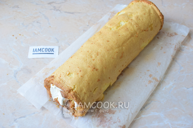 Сверните бисквит в рулет вместе с пергаментом, заверните в полотенце и уберите в холодильник минут на 30 для остывания.