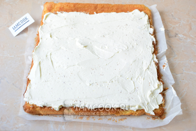 Остывший бисквит пропитайте любым сиропом или простой водой. Равномерно распределите крем, немного не доходя до дальнего края. По желанию в начинку можно добавить ягоды.