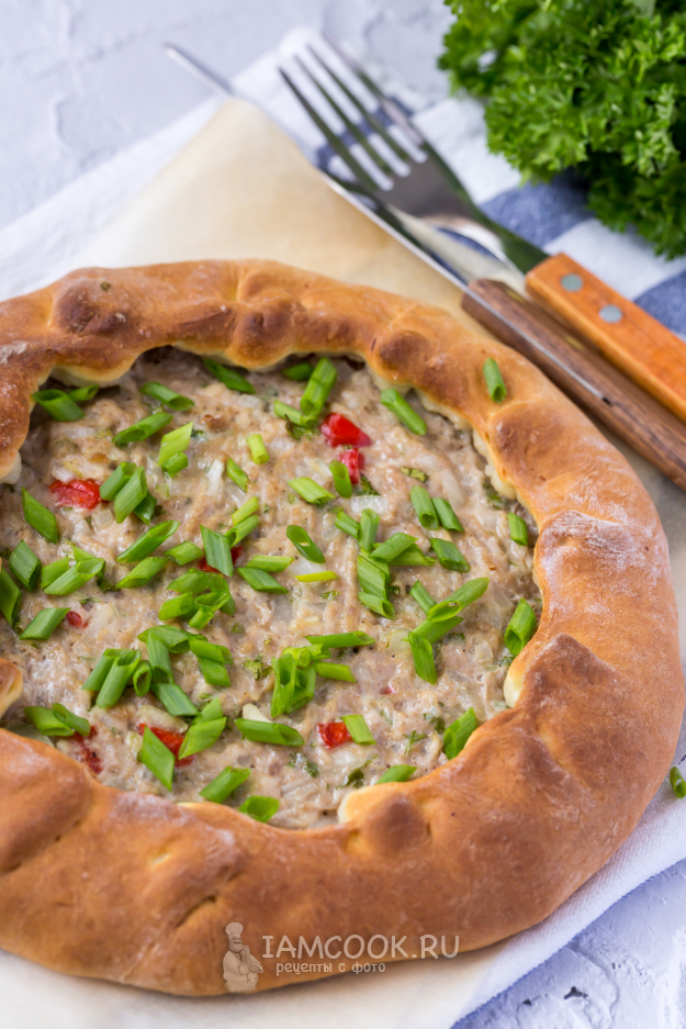 Выпекайте открытый мясной пирог с фаршем в разогретой до 200 градусов духовке 25-30 минут.