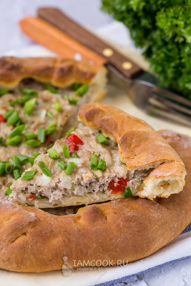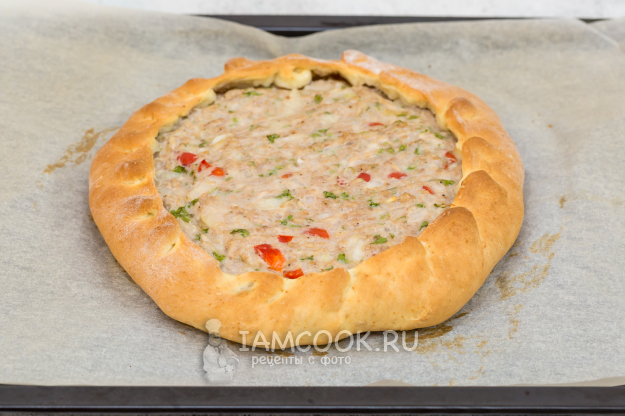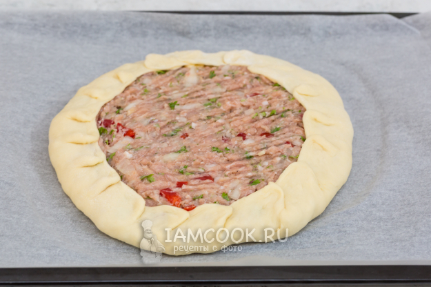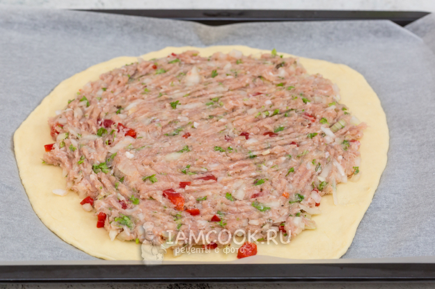 На середину круга выложите фарш (его тоже разделите на две части). Разровняйте (удобно это делать вилкой).