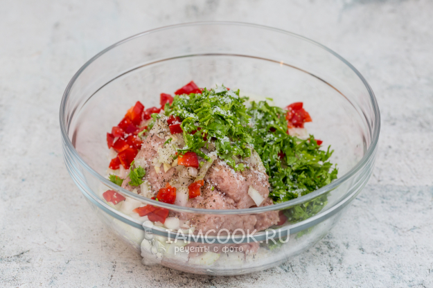 Смешайте фарш, нарезанные перец и лук, добавьте измельчённый чеснок, соль, перец, кинзу.