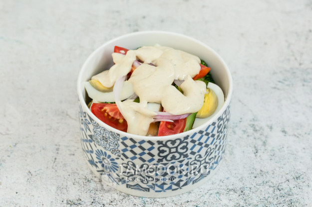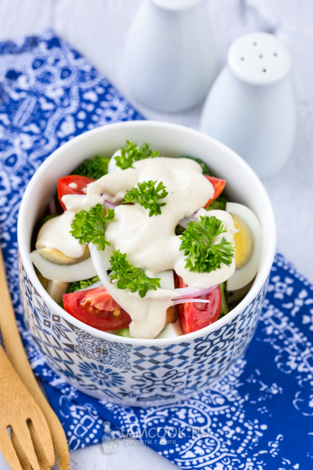 Если хочется чего-то более изысканного, скажем так, то в любом порядке выложите слоями брокколи, нарезанные крупными дольками помидоры и яйца, нарезанный четверть-кольцами лук. Слои чередуйте с заправкой.