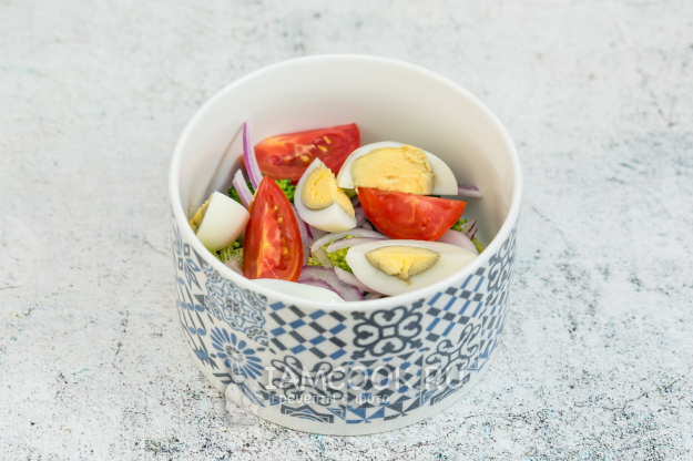 Яйца необходимо заранее отварить и остудить если не до холодного, то хотя бы до умеренно теплого. Кстати, у меня на фото шесть яиц, их так много, потому что они маленькие. С помидорами - та же история.