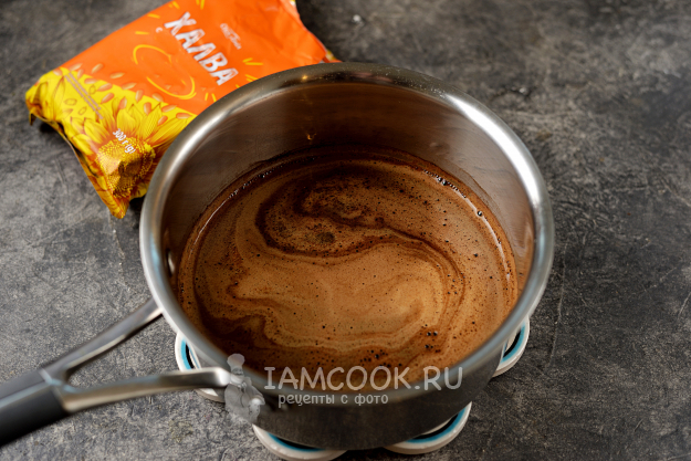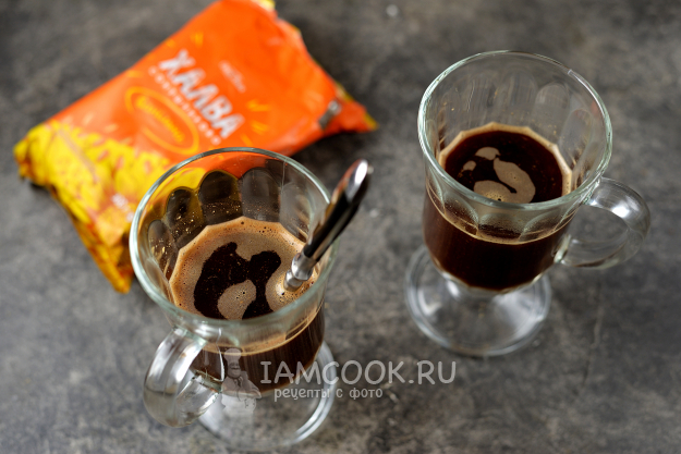 Разлейте кофе по высоким стаканам, положите в каждую порцию столовую ложку халвы, размешайте чайной ложкой.