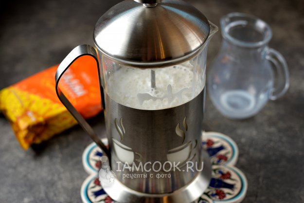 Нагрейте молоко до горячего состояния, перелейте его в френч-пресс, взбейте молоко поршнем до состояния устойчивой пены. Если у вас есть вспениватель-капучинатор, тогда можно взбить молоко с помощью этого девайса.