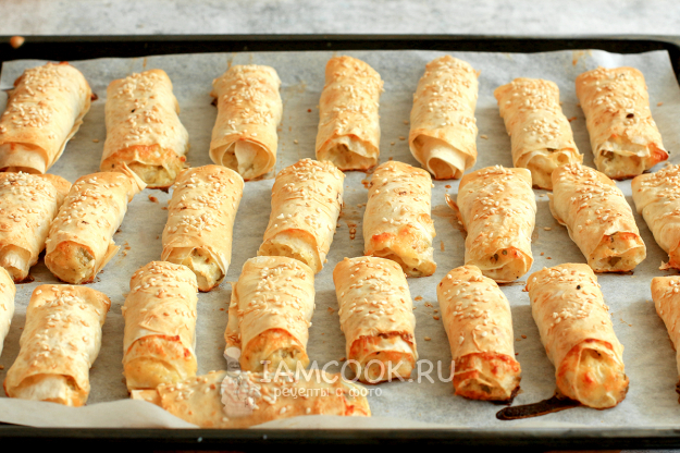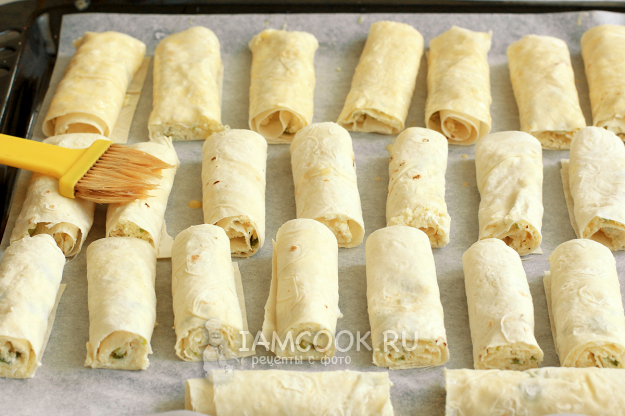 Если решите обжаривать трубочки в сковороде, то смазывать яйцом их не нужно. Просто в небольшом количестве растительного масла обжарьте их с двух сторон до зарумянивания.