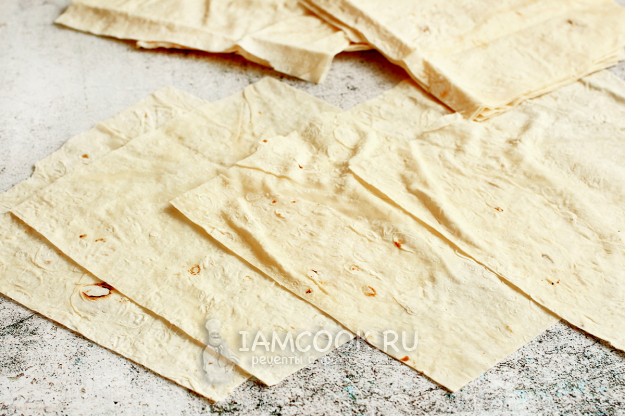 Лаваш нарежьте на удобные квадраты, у меня - по 15 см, но потом я еще разрезала пополам все трубочки.